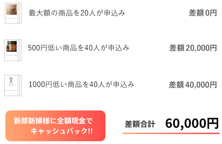 ※キャッシュバックの金額は、実際の商品の選ばれ方により変動します。掲載している実質価格は、2023年6月1日時点の掲載商品平均価格に基づいたキャッシュバックを前提としており、実質価格を保証するものではありません。なお実質価格は十単位以下は省略しております。 ※カタログギフトはお申し込みハガキの有効期限切れ後にお申し込み頂いた場合も、一定の期間商品の発送を行っております。そのため、最終的に利用されなかったご注文に関しては、差額キャッシュバックの集計対象外となります。(申込みがあったゲスト様の一覧をお送りすることができますので、まだご利用になっていないゲスト様に対し、カタログギフトのご利用をお声がけ頂くと、大半の方にお申し込み頂けます。)