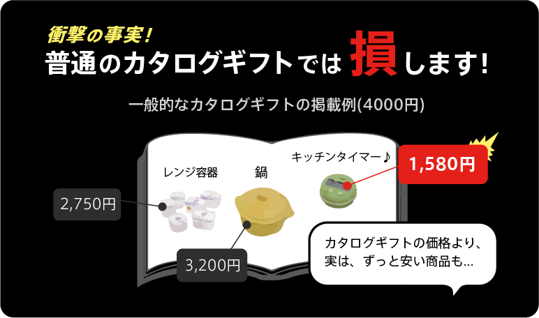 実は、どのカタログギフトでも1冊に掲載されている商品の金額はバラバラです!もちろん、すべて同じ金額で商品を揃えることは不可能なので仕方がないことですが、購入者が気が付かないうちにその差額の分だけ損をする仕組み(=業者の利益)となっていました。