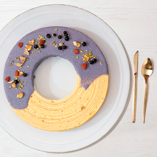 こだわりのバウムクーヘンに、オーガニックゴジベリー、ワイルドブルーベリー、生クルミ、グリーンピスタチオをトッピング。オーガニックのアサイーとマキベリーで作ったチョコレートでコート。(合成着色料不使用)